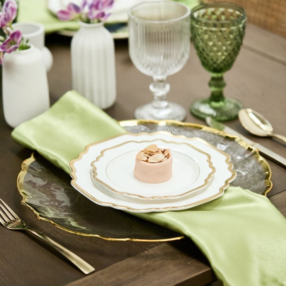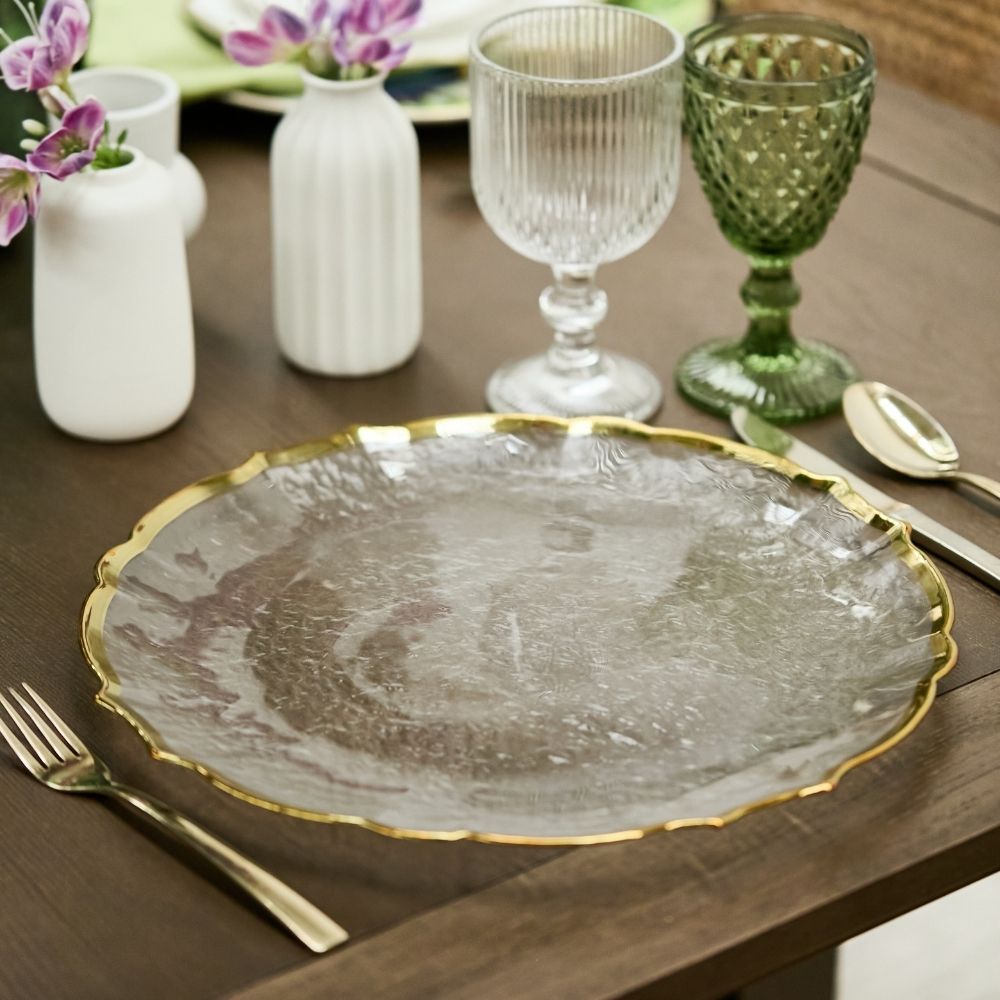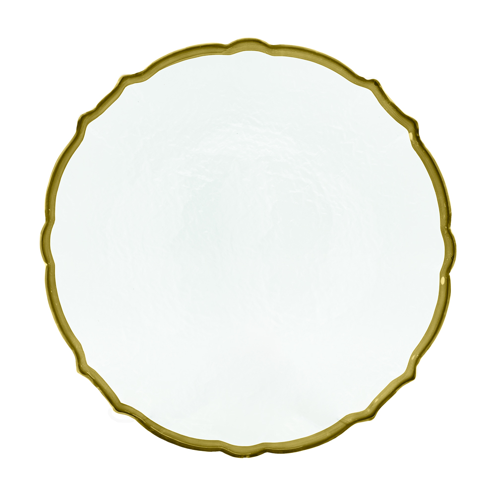 Baja plato transparente con borde ondulado dorado y diseño clásico. Material: vidrio.