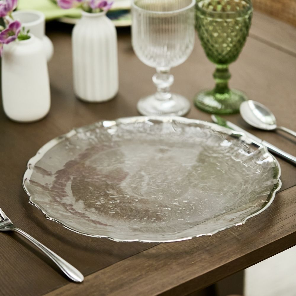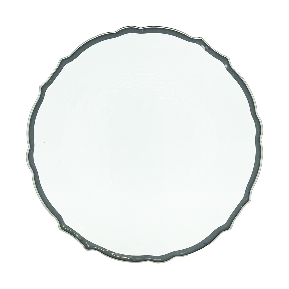 Baja plato transparente con borde ondulado plateado y diseño clásico. Material: vidrio.