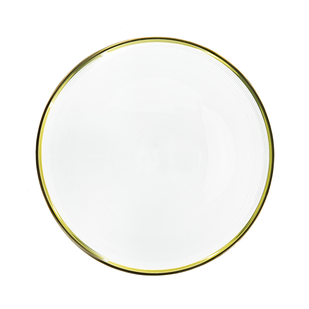 Baja plato transparente con acabado liso y elegante borde dorado. Material: vidrio.