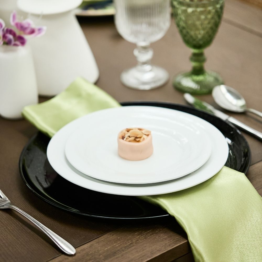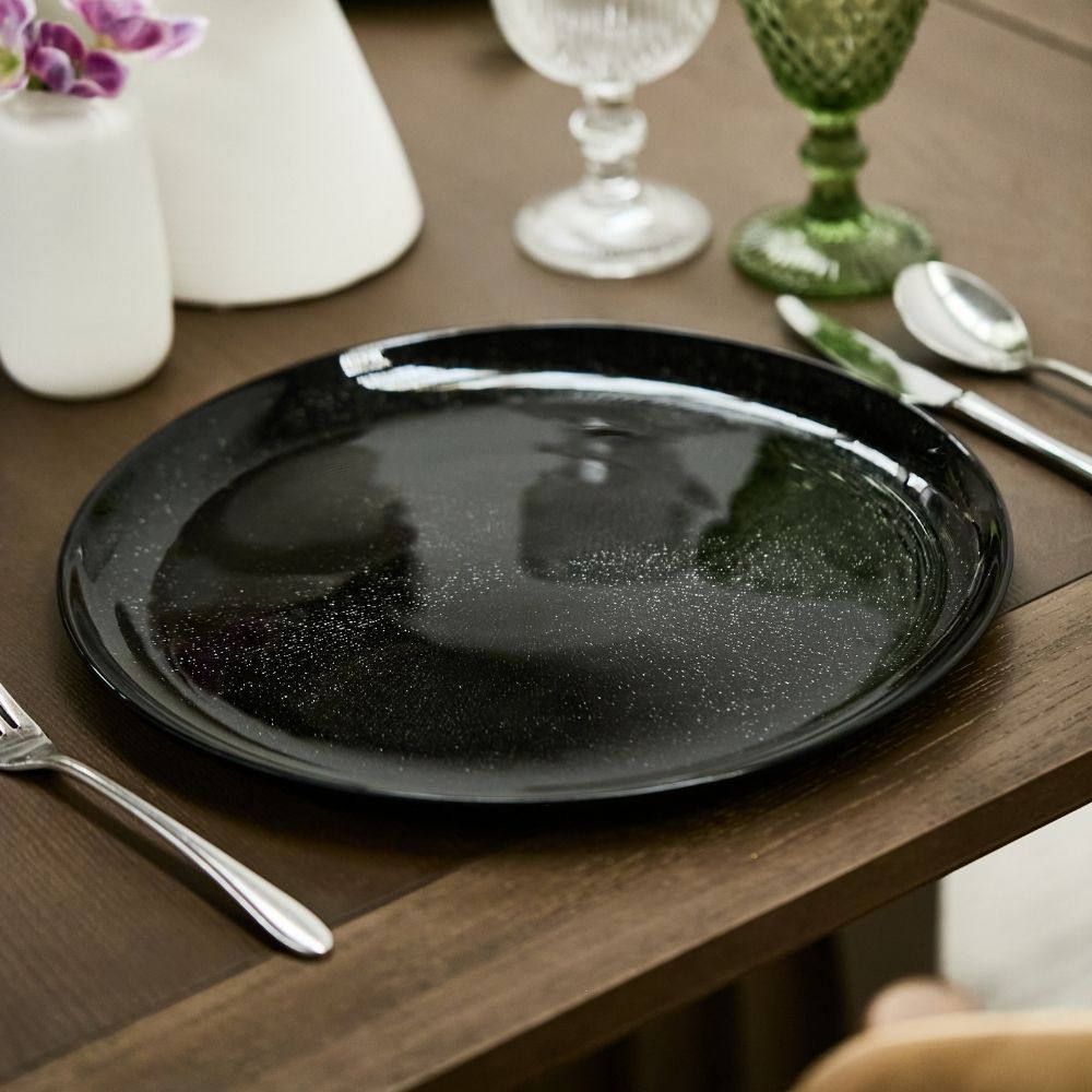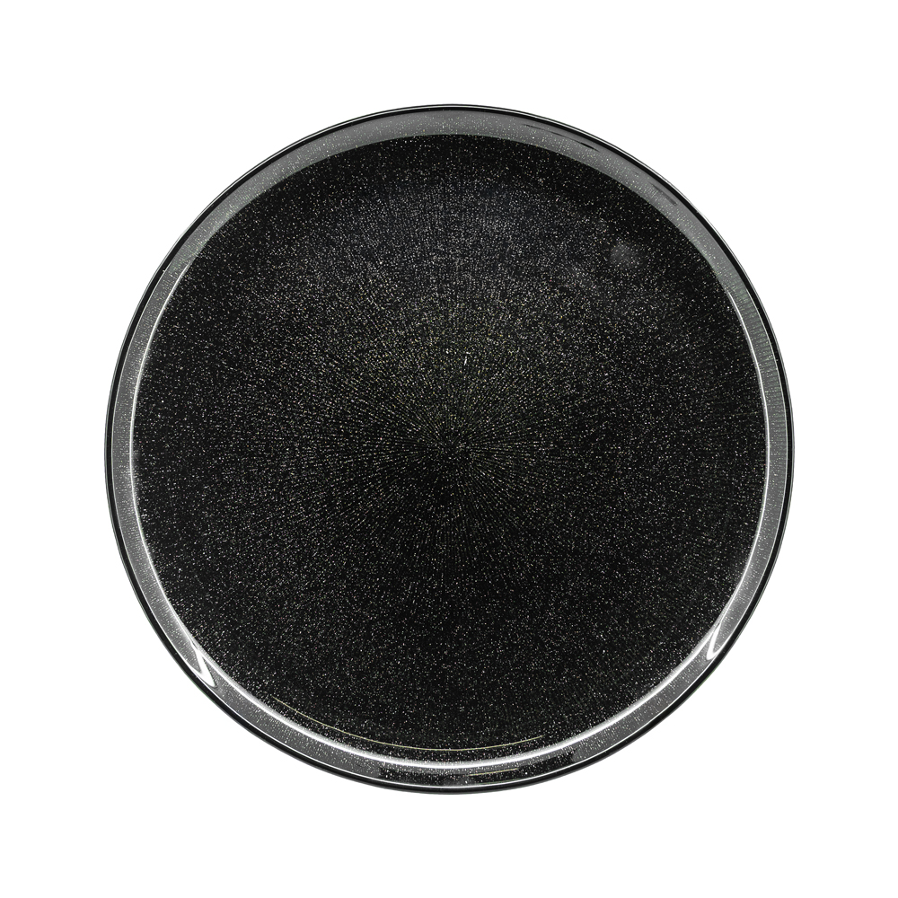 Baja plato en color negro con acabado brillante y sutil efecto texturizado. Material: vidrio.