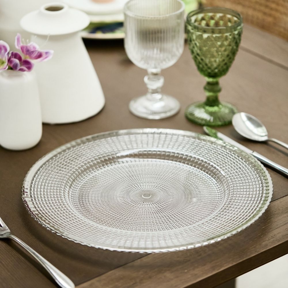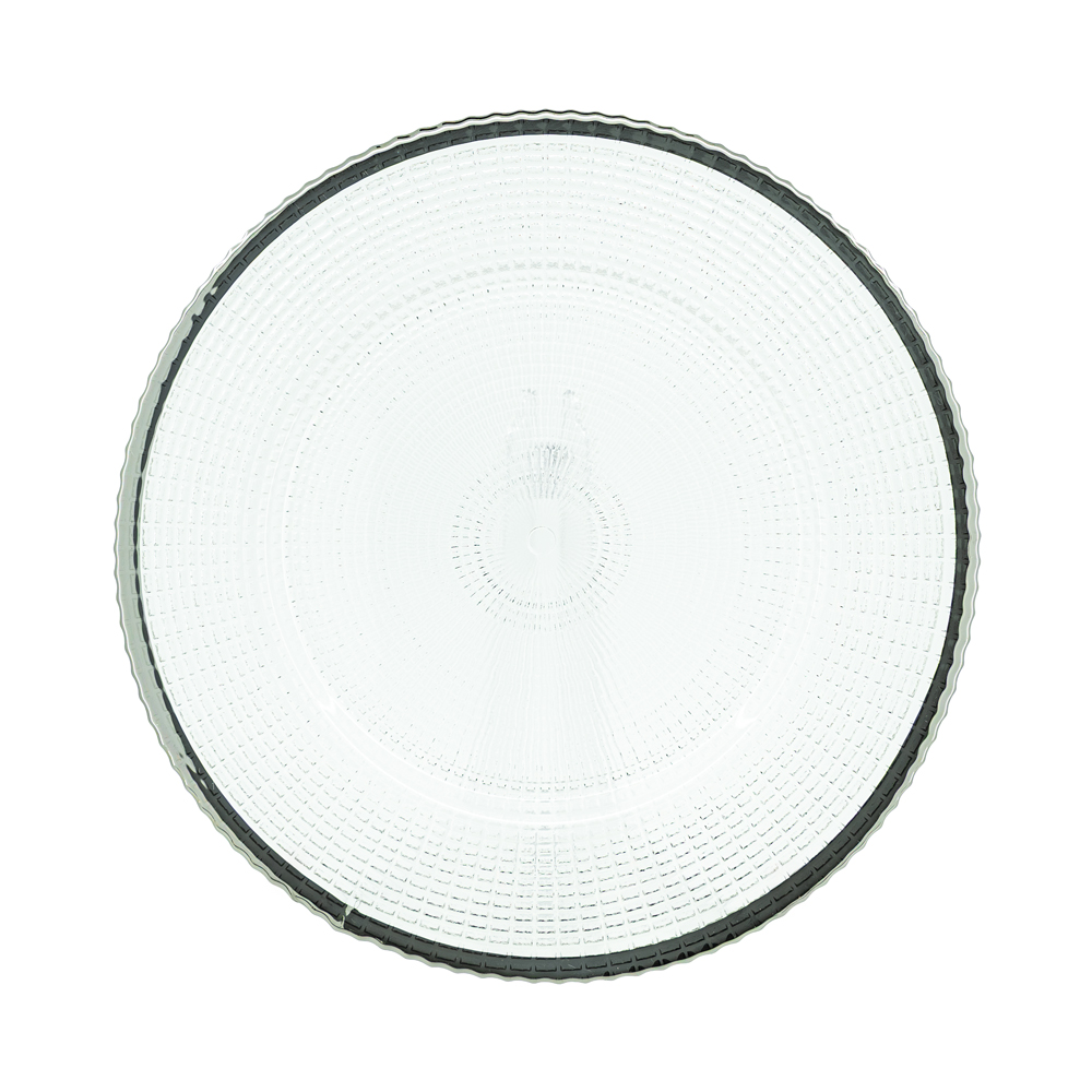 Baja plato transparente con textura de tejido y borde plateado. Material: vidrio.