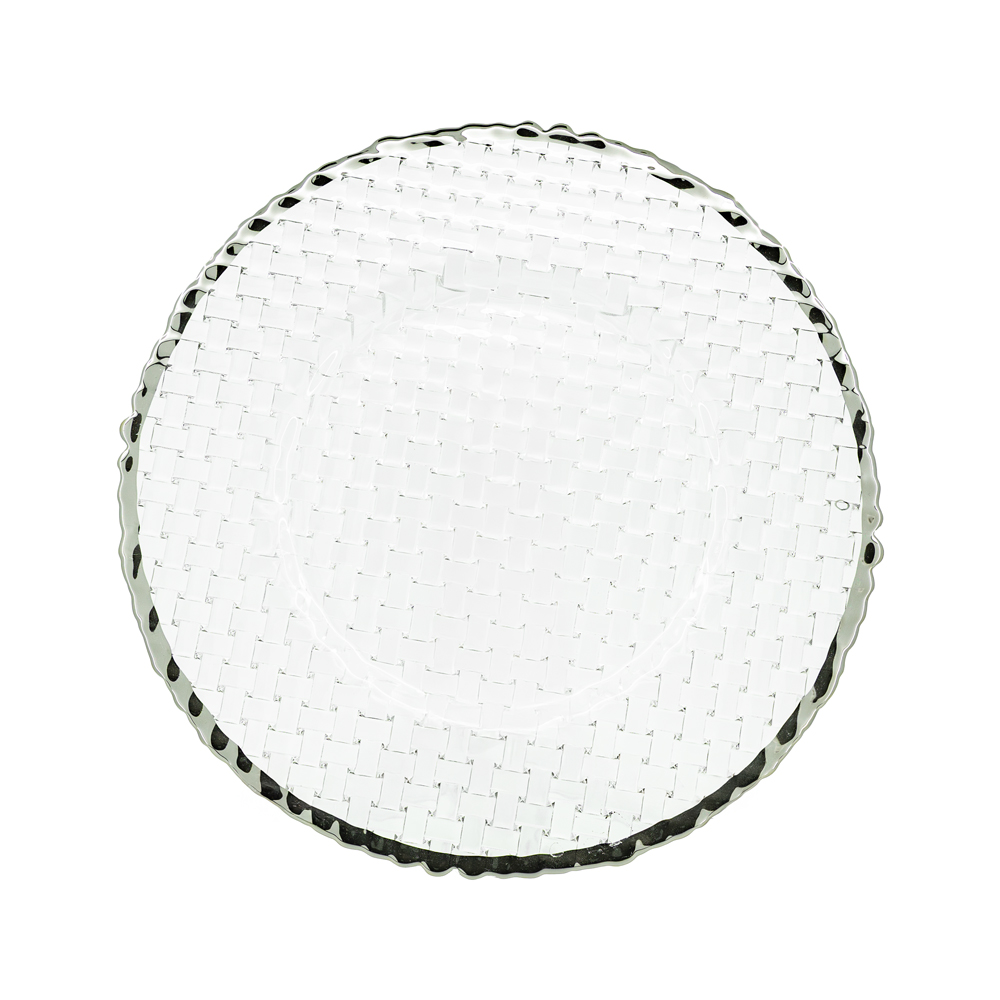 Baja plato transparente con diseño tejido y borde ondulado plateado. Material: vidrio.